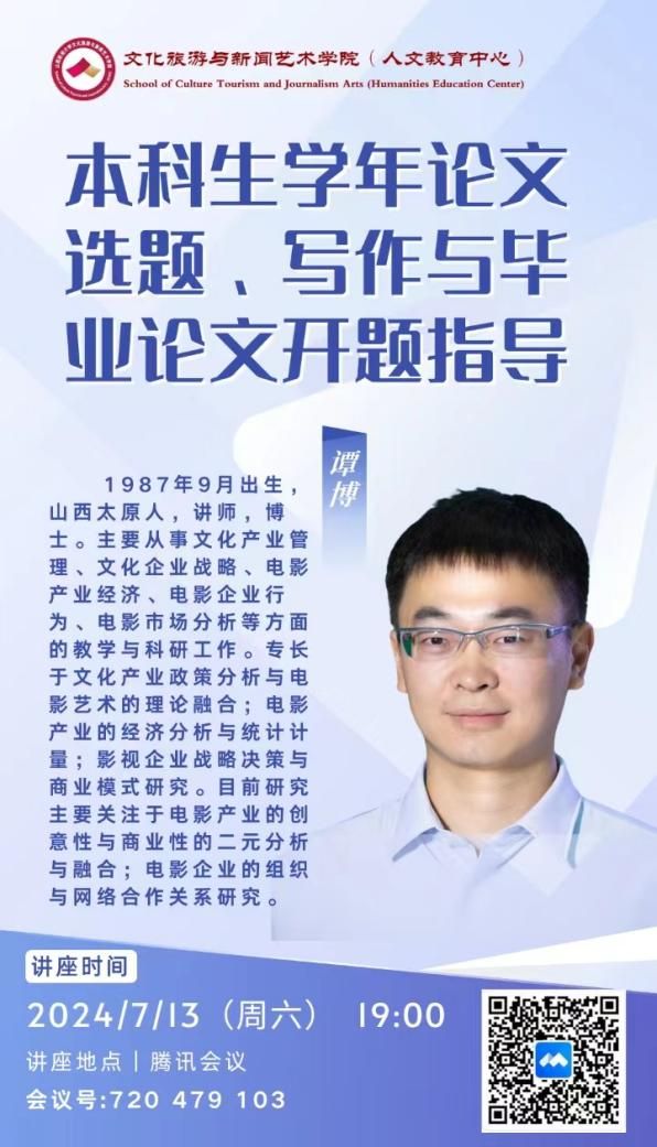 文化产业管理专业和旅游管理专业开展了系列讲座。7月13日晚7点,谭博老师在腾讯会议开启了时长2小时的本科生学年论文与毕业论文的主题讲座。