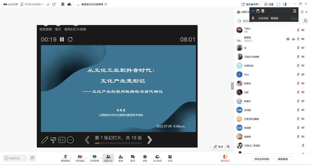 7月9日上午,文化产业管理专业开展“小学期”系列在线讲座,由高慧慧老师主讲,主题为创意经济与文化治理 讲座聚焦“文化产业的批判性路径与当代转化”,回溯文化工业的经典批判,追踪创意经济话语的全球扩展与在地译介,深入剖析其背后的治理逻辑与文化商品化机制。2022级、2023级和2024级文化产业管理专业学生参加讲座,张黎敏、焦敬华等教研室全体教师参与