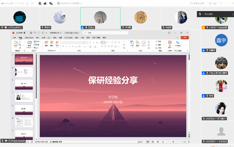2026年1月21日晚8点,文化产业管理专业小学期实践活动——科研训练类实践项目讲座“研途有光:与学姐们走好备考每一步”在线上如期举行。本场讲座特邀文化产业管理专业五位成功保研的学姐,面向大一至大三年级学生,系统分享保研准备与应试经验,助力学子明晰方向、踏实前行,讲座由贾垚焱老师主持。