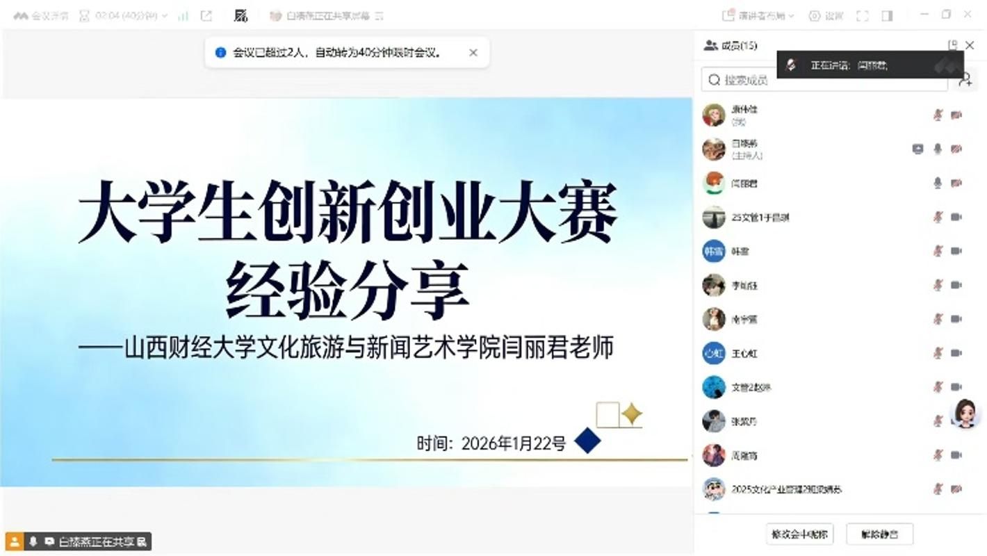 2026年1月22日上午,文化产业管理专业以线上形式成功举办小学期系列讲座,本次讲座由闫丽君老师主讲,讲座主题为“大学生创新创业大赛经验分享”,所指导的2022级至2025级共14名学生全员线上参与,沉浸式汲取大赛实战经验与专业指导。